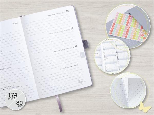 -týždenné rozvrhnutie (2 strany = 1 týždeň) -mesačný a ročný plánovač na roky 2026/2027 -s plánovačom narodenín a darčekov -s mapou sveta -so zoznamom úloh -s nálepkami "ikonky"