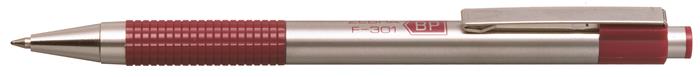 Telo guľôčkového pera F-301 vyrobené z nehrdzavejúcej ocele je zárukou štýlovosti a trvanlivosti. Vrúbkovaný úchop zaručuje pohodlné a stabilné písanie. Farba tela je bordová, farba atramentu modrá. Priemer guľôčky: 0,7 mm, hrúbka písma: 0,24 mm. Typ náplne: F.