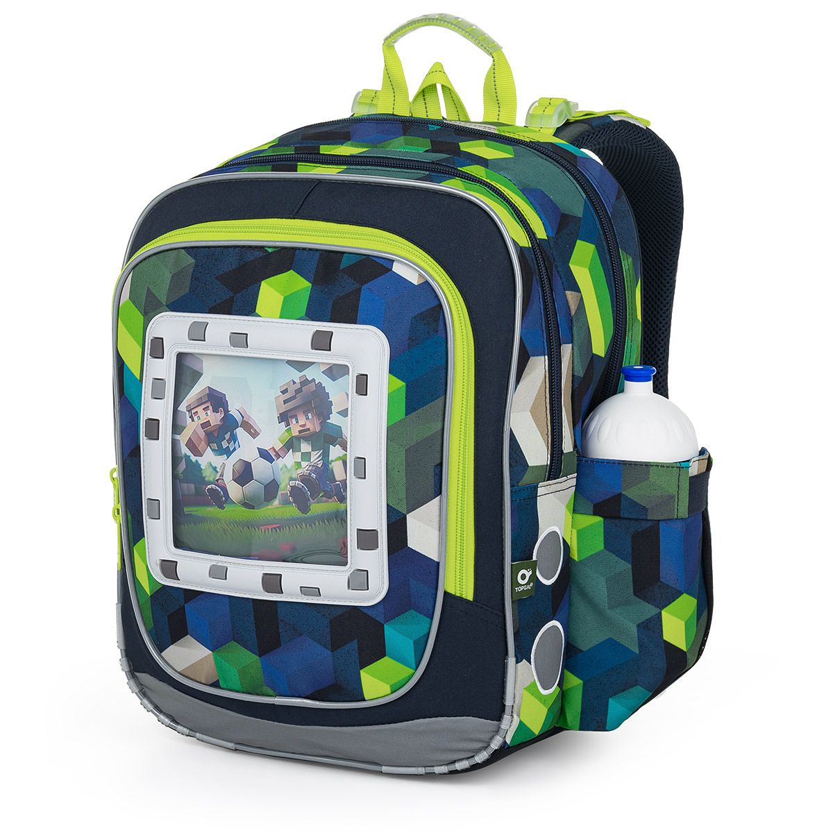 Ultraľahká dvojkomorová školská taška s vymeniteľnými obrázkami Minecraft pre chlapcov od výšky 110 cm. Hravý batoh obsahuje štyri obrázky, ktoré sa dajú ľubovoľne meniť.