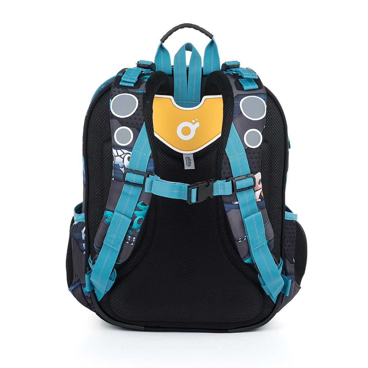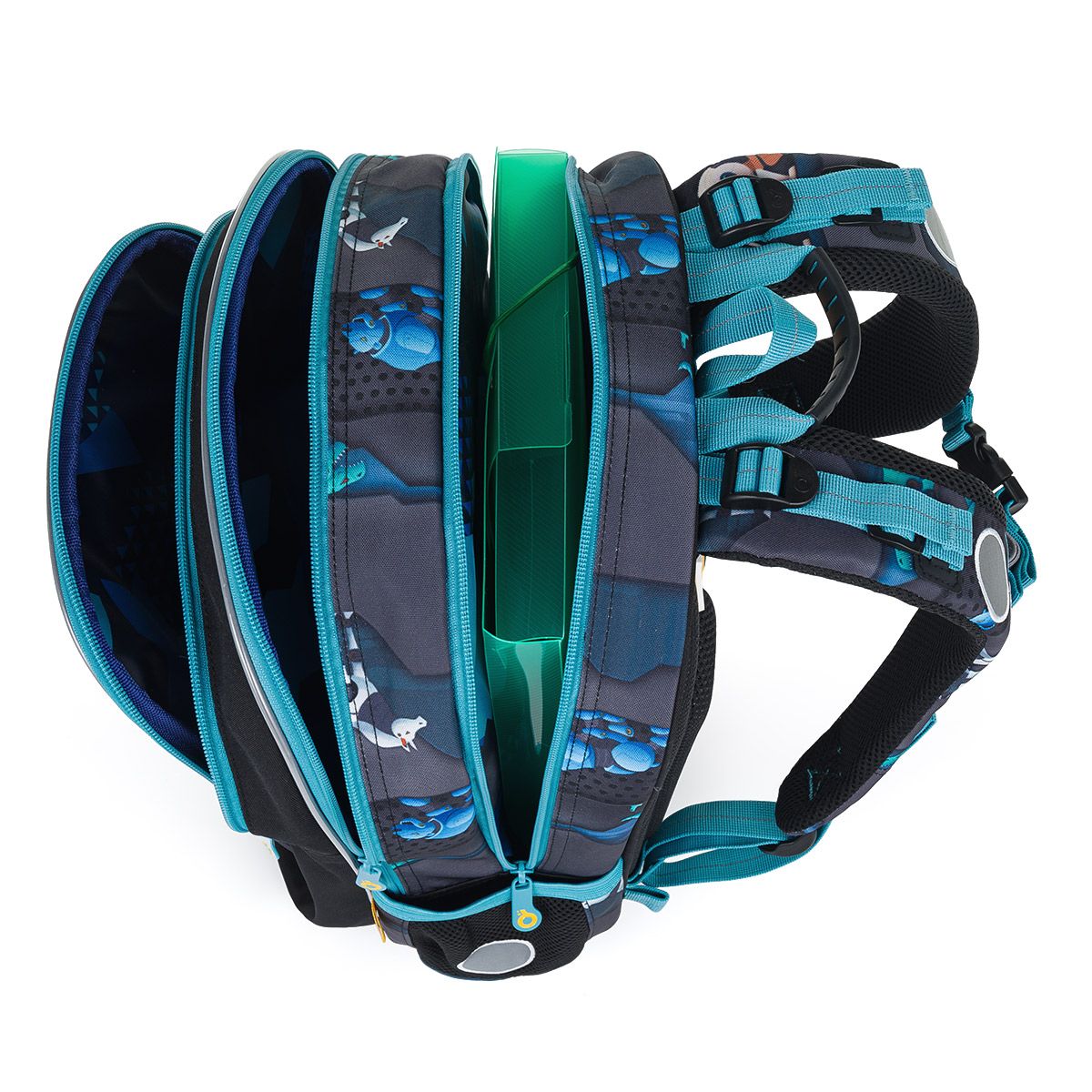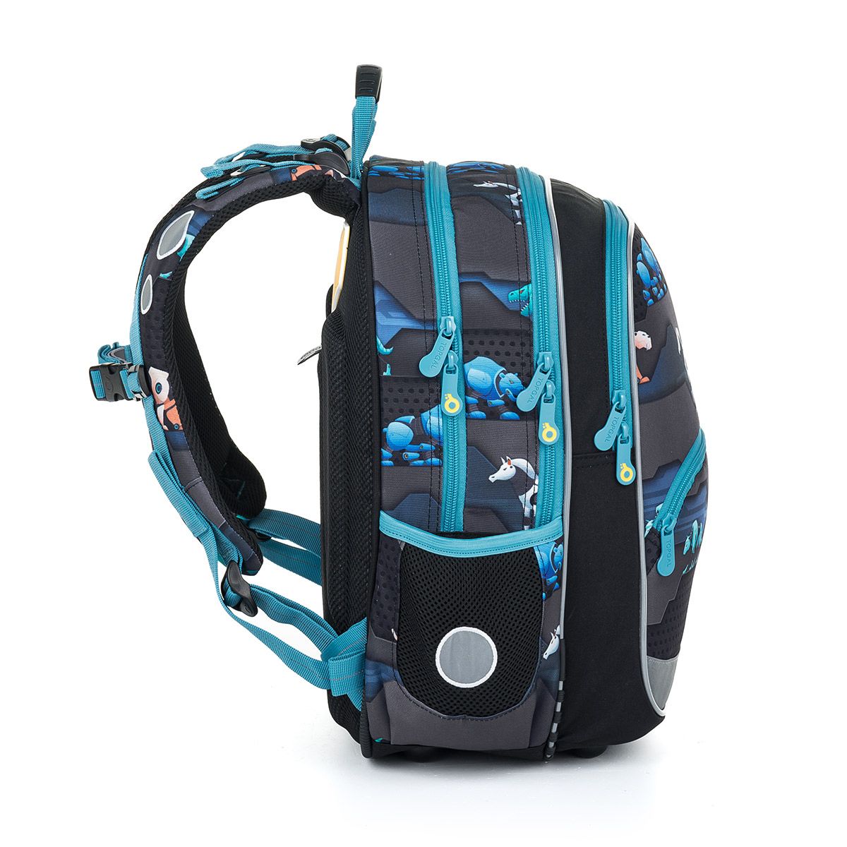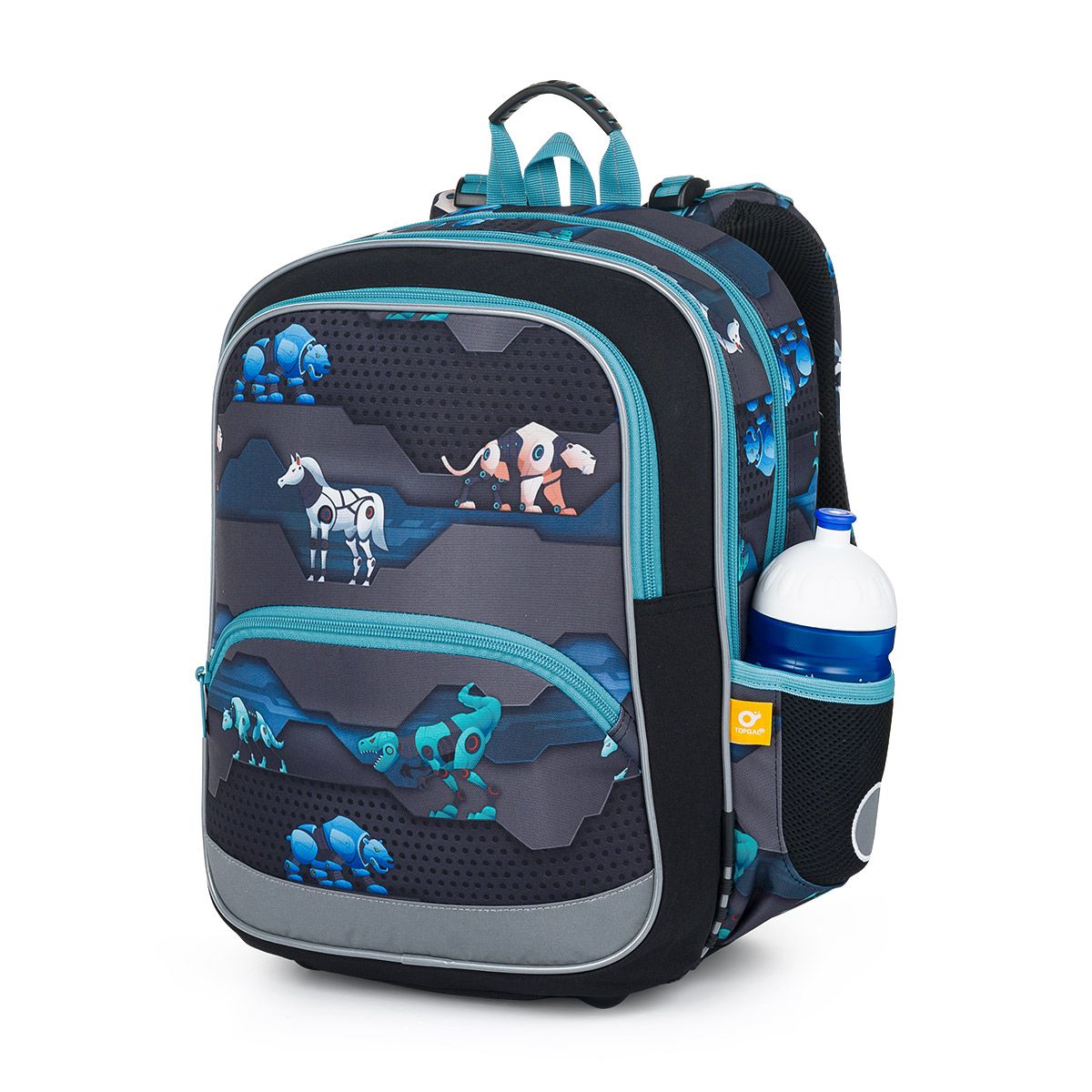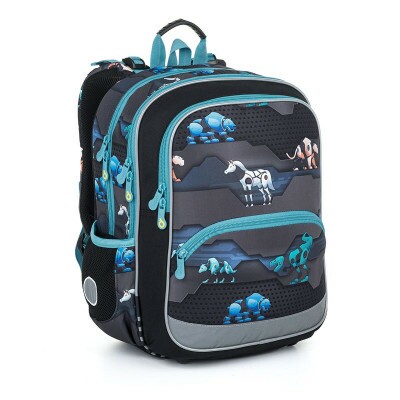 Dvojkomorová školská taška v tmavom dizajne je vhodná pre všetkých chlapcov s výškou 115 cm a viac. Motív zvieracích robotov urobí radosť všetkým budúcim inžinierom.
