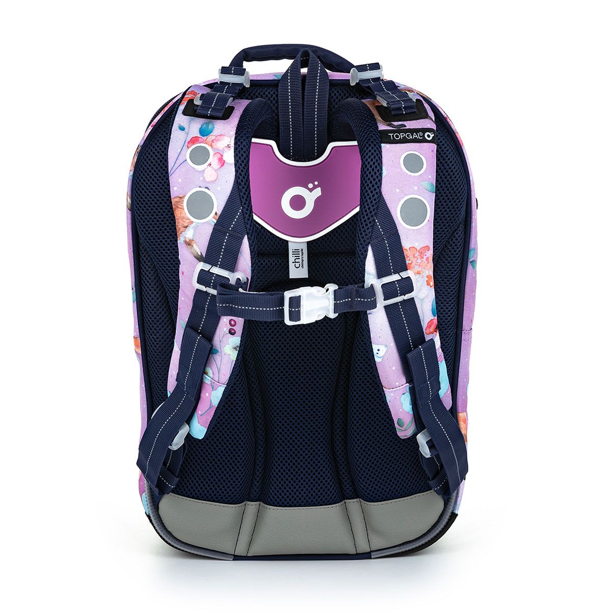 Taška má pevný, anatomicky tvarovaný chrbát s ľahkou hliníkovou výstuhou. Aj keď je strih COCO objemný, správne ho nastavíte aj na chrbát drobnejších dievčat, a to vďaka uťahovaniu anatomicky tvarovaných ramenných popruhov v ich hornej časti k chrbtu av spodnej časti na výšku. Samozrejmosťou je hrudný popruh, vďaka ktorému taška z chrbta padať určite nebude. Voľné konce ramenných popruhov pripnite k telu ramenného popruhu pomocou magnetov v ich koncoch.