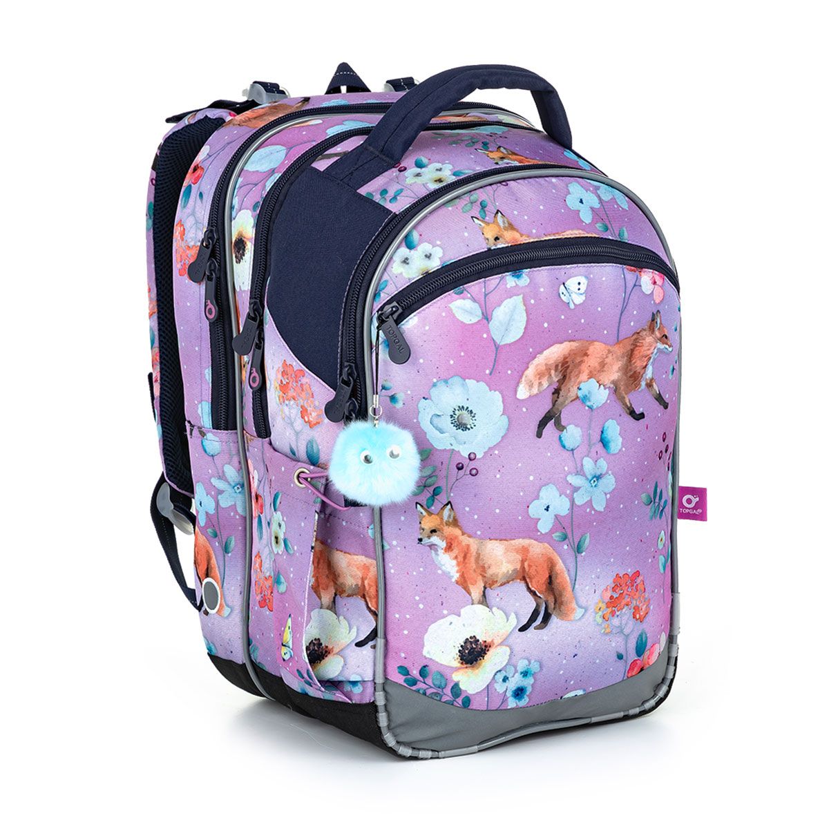 Trojkomorová objemná taška vhodná na celý prvý stupeň ZŠ s motívom líšok a kvetov na fialovom pozadí.
