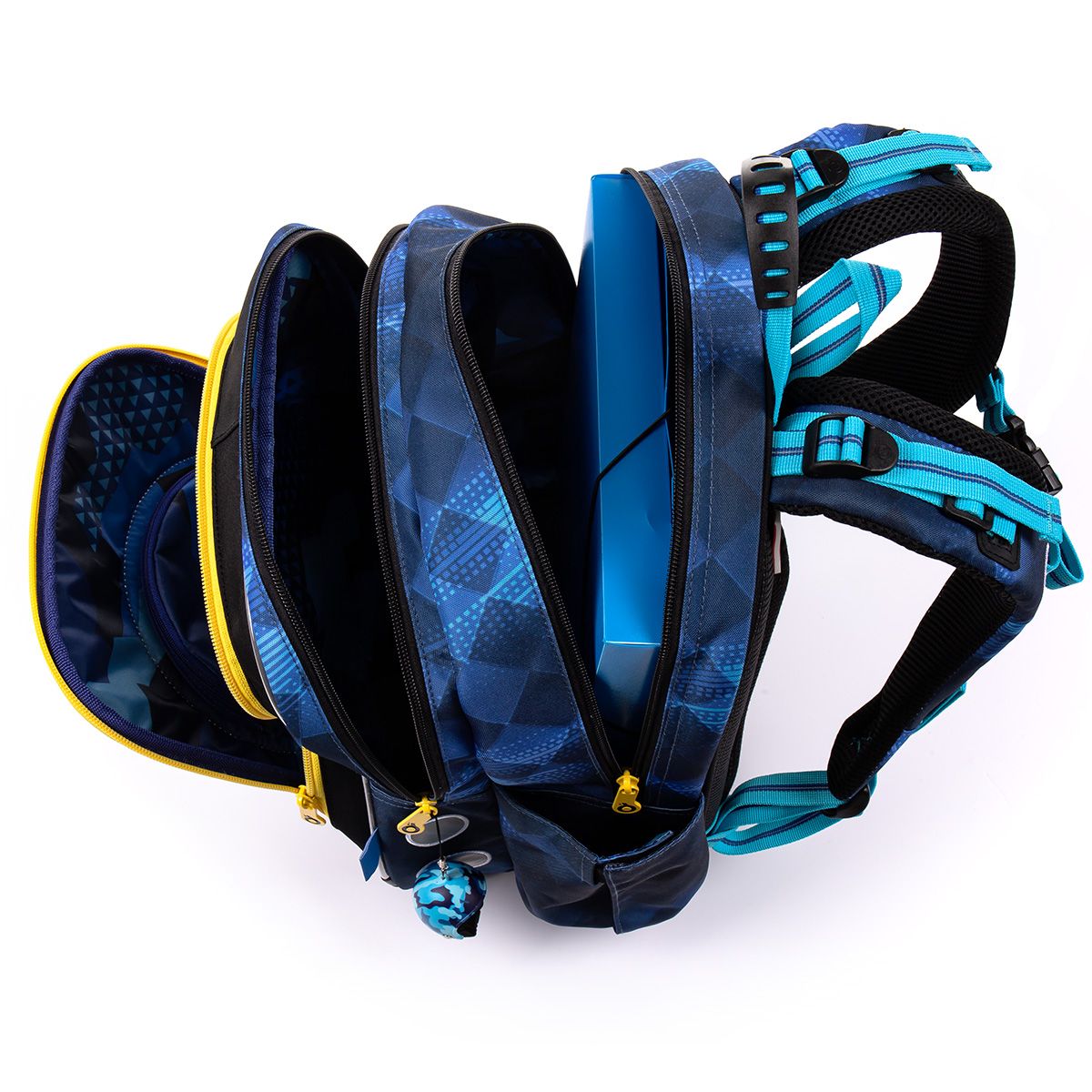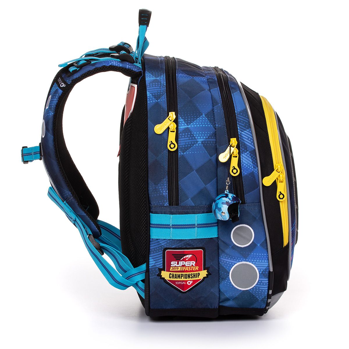 Najťažšie školské potreby dávajte vždy do zadnej komory. Tá je širšia ako predná a zltne všetko potrebné do prvých tried ZŠ. Predná, užšia komora unesie všetko ostatné a navyše v nej určite využijete praktickú sieťovú kapsu na zips. Menovka ukrytá v prednom vrecku nad sieťovou kapsičkou pomôže tašky rozoznať, aj keď sa v triede stretnú dva rovnaké. Ako bonus nájdete na zipse predného vrecká parádny miniatúrny motorkársky prívesok! ...