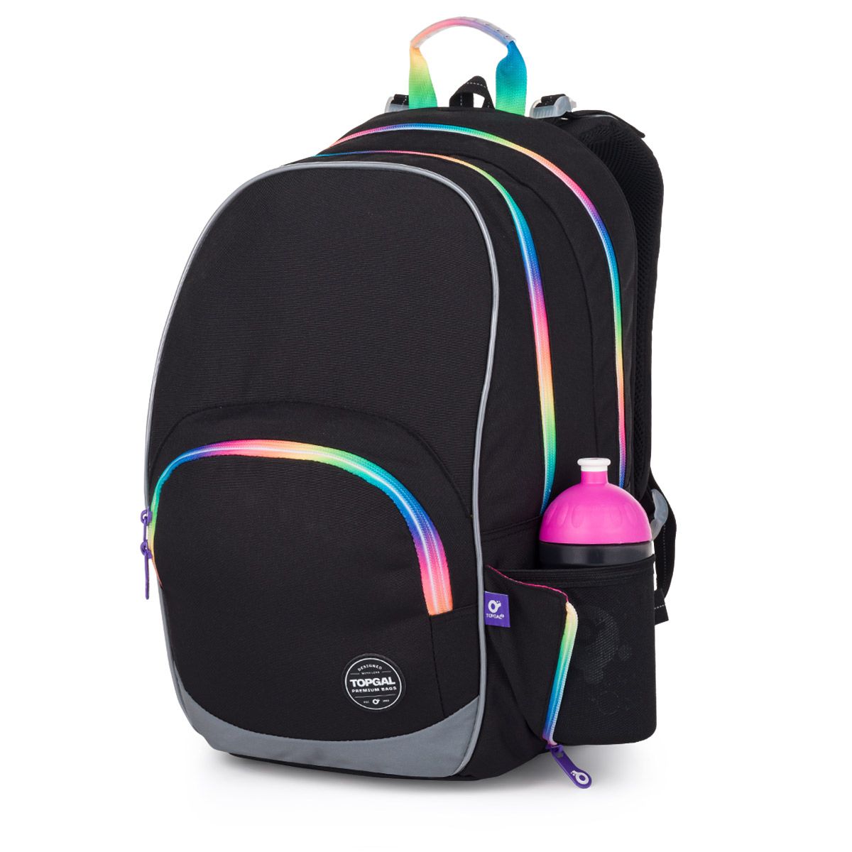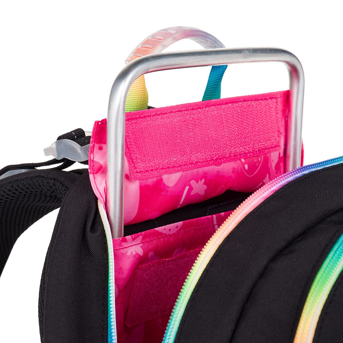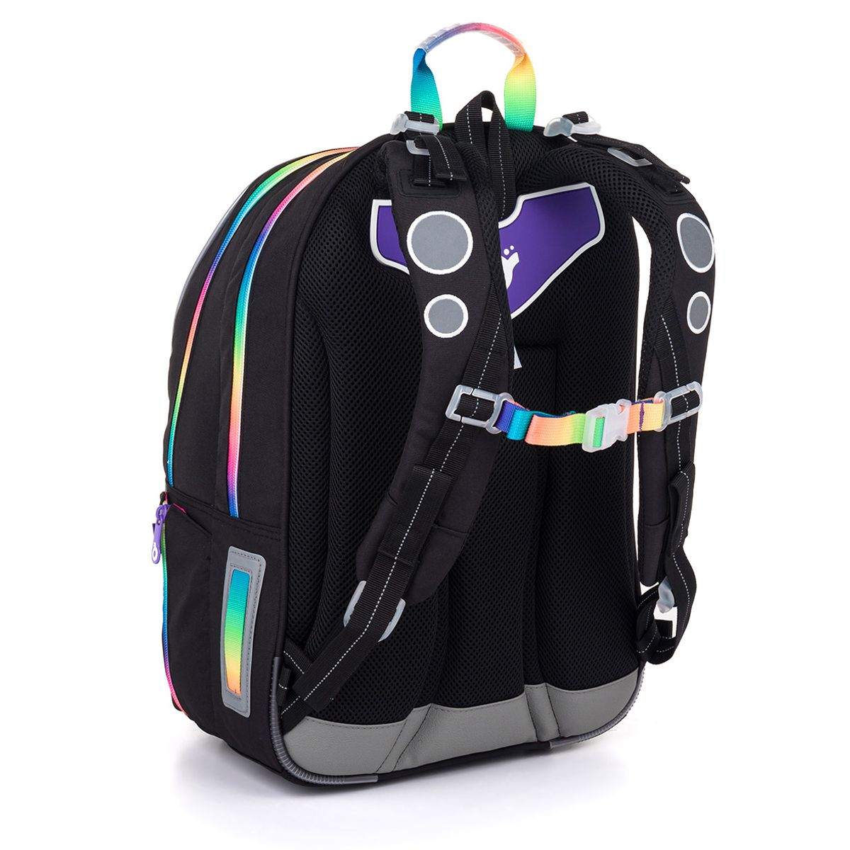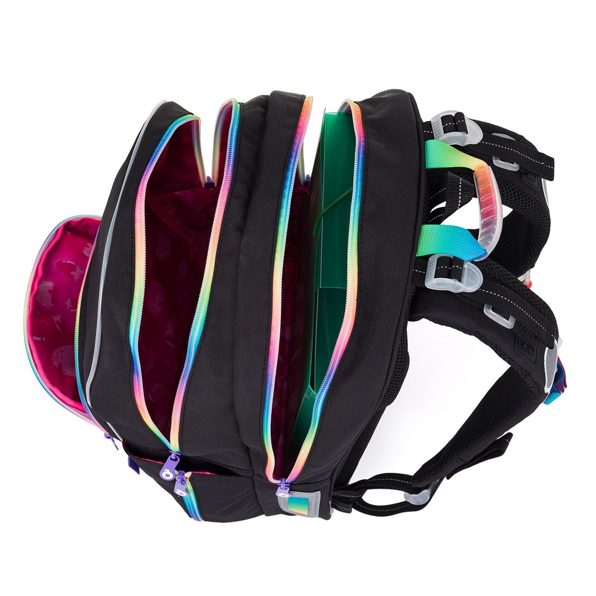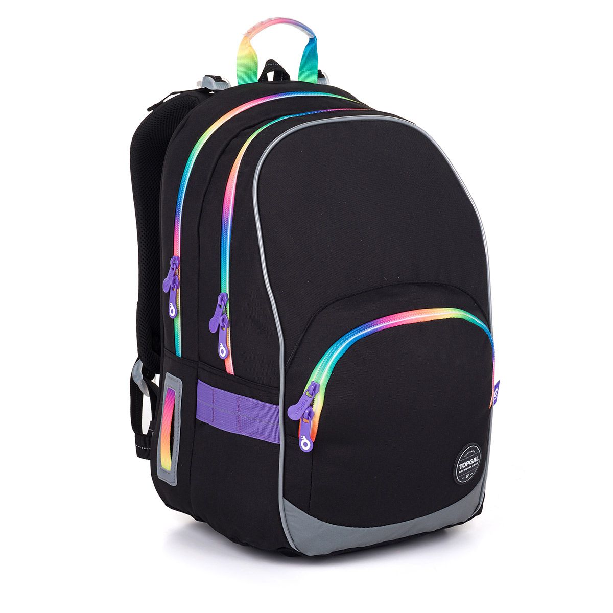 Čierna dvojkomorová školská taška je ideálna pre dievčatá od výšky 125 cm. Túto čiernu klasiku spestrujú špeciálne farebné zipsy s fialovými ťaháčikmi. Kto sa nebojí zapôsobiť?