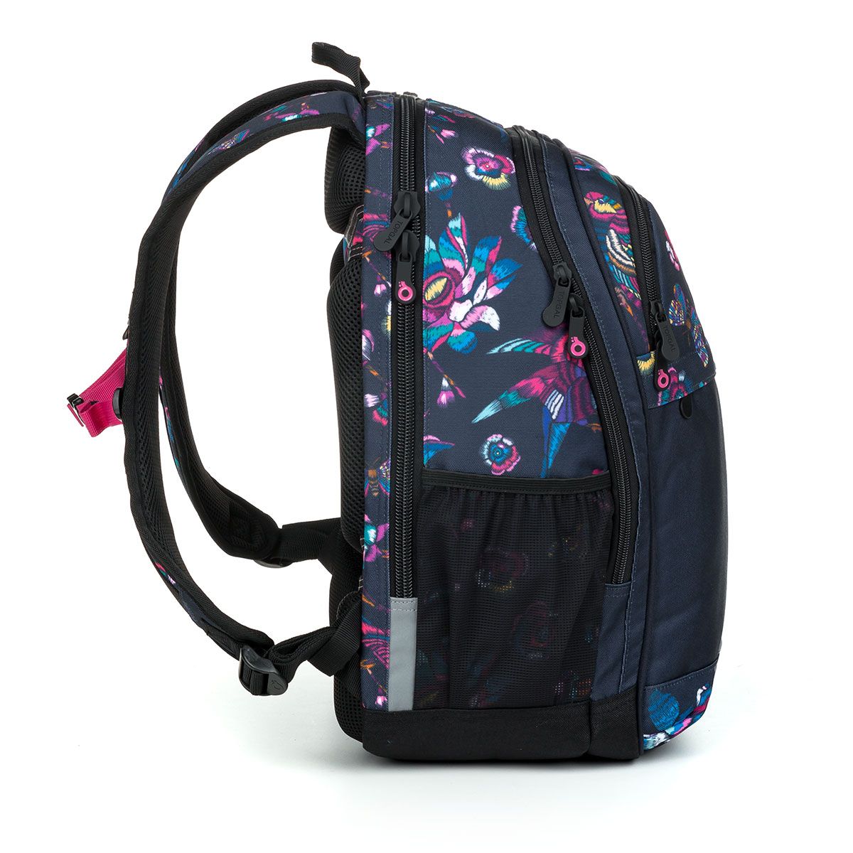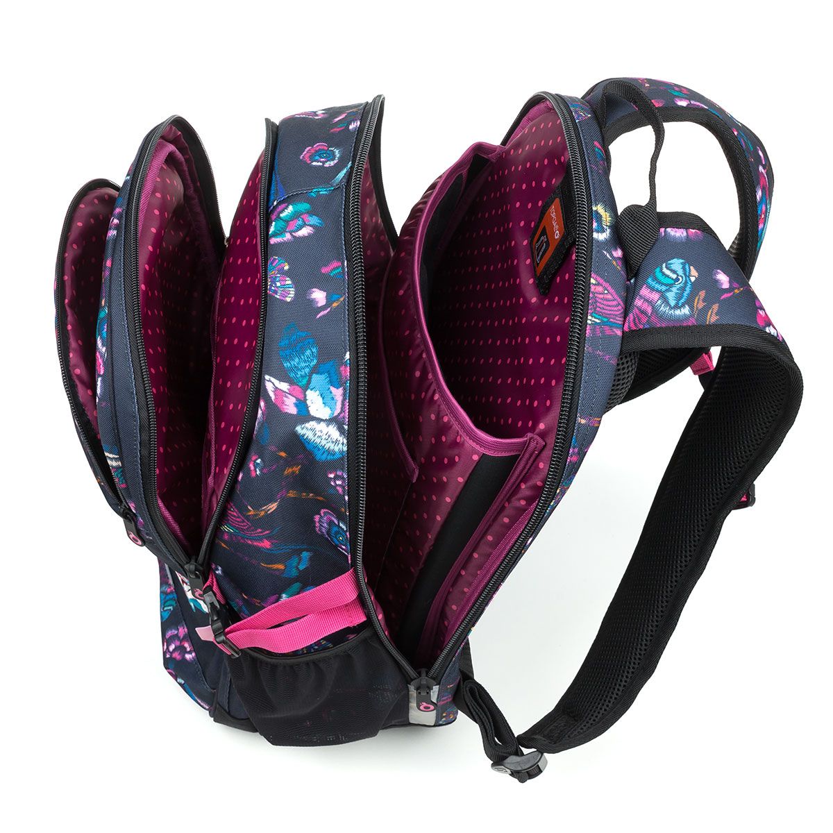 Predná užšia komora „zhltne“ všetky drobnosti a navyše je v nej aj menšie vrecko na zips, ktoré dobre poslúži napríklad na uloženie mobilu tak, aby bol po ruke. Na čele batohu je veľké hlbokévrecko a ešte jedna menšia kapsa, ktorá je od tej väčšej pomyselne oddelená nielen strihom, ale aj potlačou s ružami.