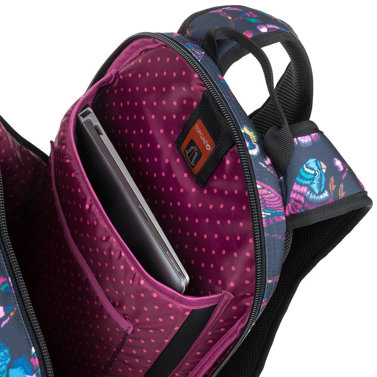 Zadnú širokú komoru sme objemovo "nafúkli", takže sa do nej zmestí nielen notebook, ale aj zošity a ťažké učebnice. Vďaka vnútornomu polstrovanému vrecku v zadnej komore bude v bezpečí notebook až do veľkosti 15,4 ". Na vrecku na notebook je navyše našitá ešte menšie polstrované vrecko na tablet, mobil alebo powerbanku.