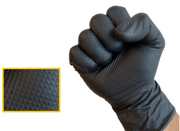 Jednorazové ochranné rukavice bez latexu, prémiová odolnosť. -nesterilné -nepudrované extra zdrsnená dlaň a prsty -s navinutým lemom --vhodné pre obe ruky -neobsahuje latex -materiál: nitril (8,4gr / 7.0 mil) AQL: 1,5 -dĺžka: 240 mm -farba: čierna -balenie: 90 ks/krabica, 10 krabíc/kartón -EU norma: 2016/425; EN ISO 374-1:2016 (JKPT); EN ISO 374-5:2016; EN 420: 2003+A1: 2009; 2017/745