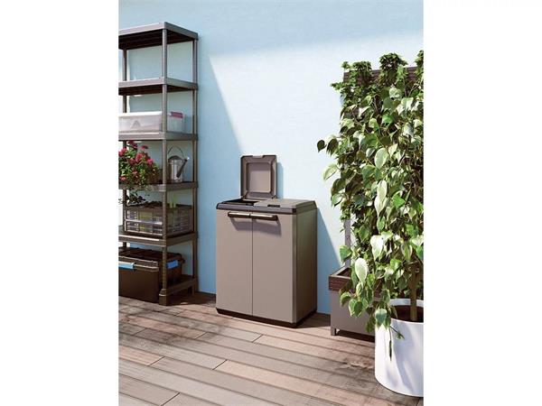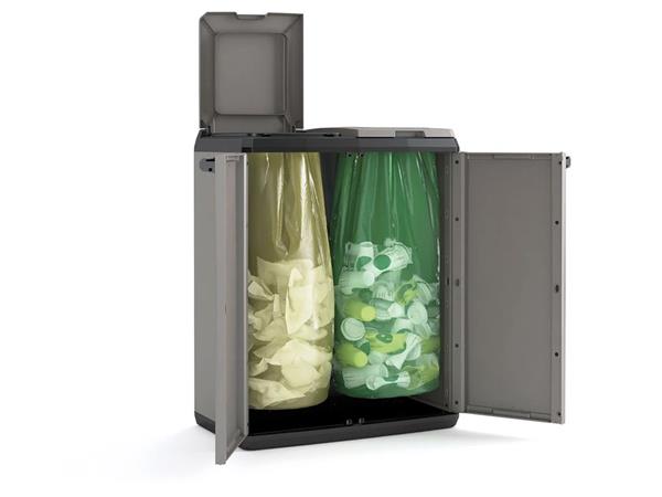KETER Split odpadkový kôš/skrinka na triedený odpad vďaka praktickému dizajnu a modernému tmavosivému/čiernemu vzhľadu štýlovo a jednoducho prispieva k ochrane životného prostredia. -vhodná na uloženie dvoch vriec s objemom do 110 litrov -vyrobená z polypropylénu, odolná voči mechanickému poškodeniu a poveternostným vplyvom, takže ju možno umiestniť v interiéri aj exteriéri, napríklad na krytej terase -ľahko sa čistí - jednoduchá montáž -vybavená dvoma hornými vekami so špeciálne tvarovanými otvormi pre jednoduché otváranie - predné dvojkrídlové dvierka s pohodlnými úchytkami -rozmery: 39x68 x85 cm (šírka x hĺbka x výška) -hmotnosť: 5,45 kg - vrecia nie sú súčasťou balenia